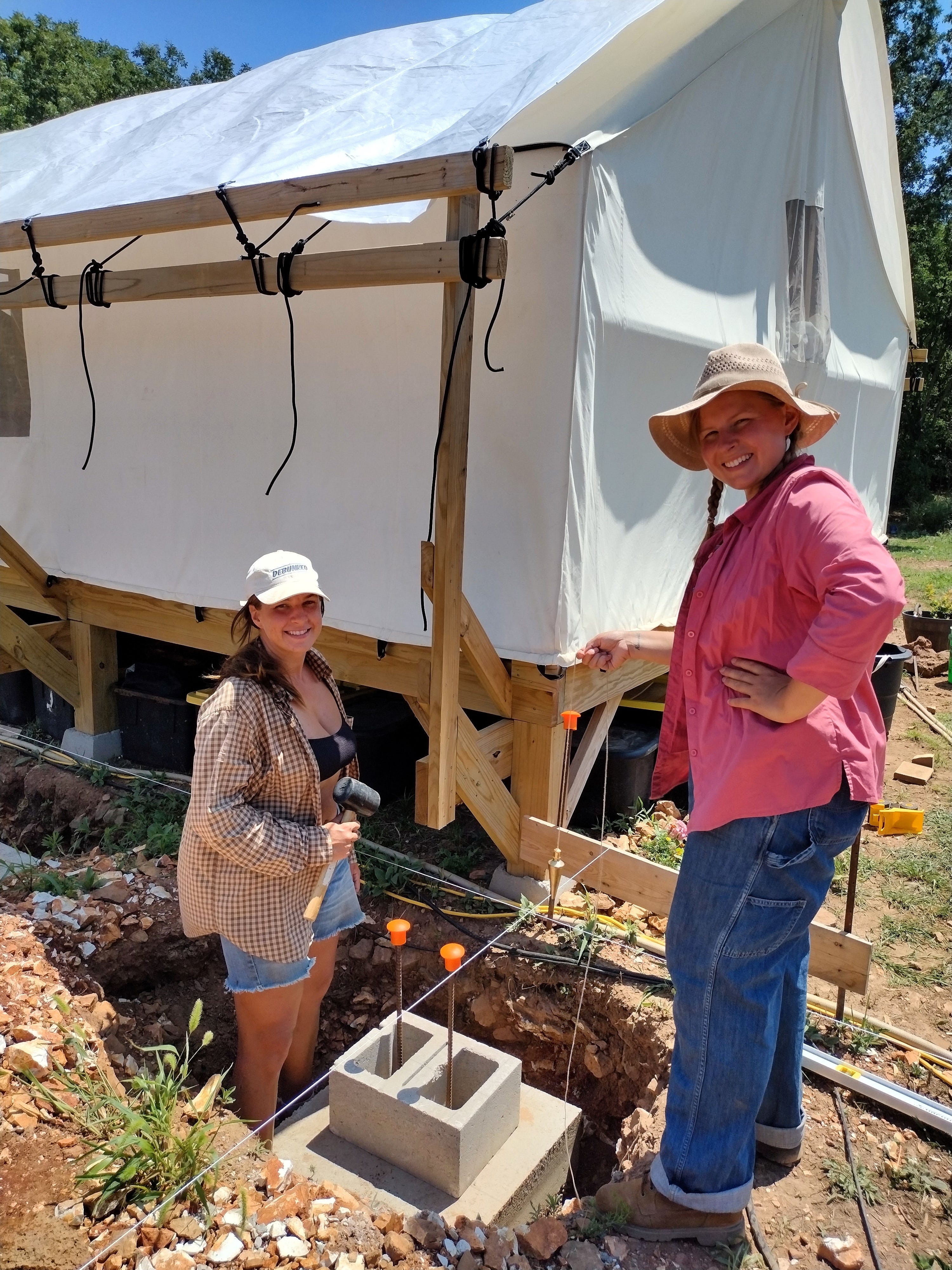 The wind wasn't too bad, so we decided to ride it out in the tent. But once the rain started, the sound was deafening. It was so loud, we could hardly talk to one another without shouting. And the rain just kept coming. Through our windows, we watched as water filled our footing holes, in some places completely submerging the footing and dry-stacked block on top (we had set out the first block for each pier). It was unbelievable. We kept an eye on our dry creek bed down the hill, too -- wondering if this rain would be enough to make it flow. And it did. The dry creek became a small river, rushing along the woods to where it dumps in the spring creek.