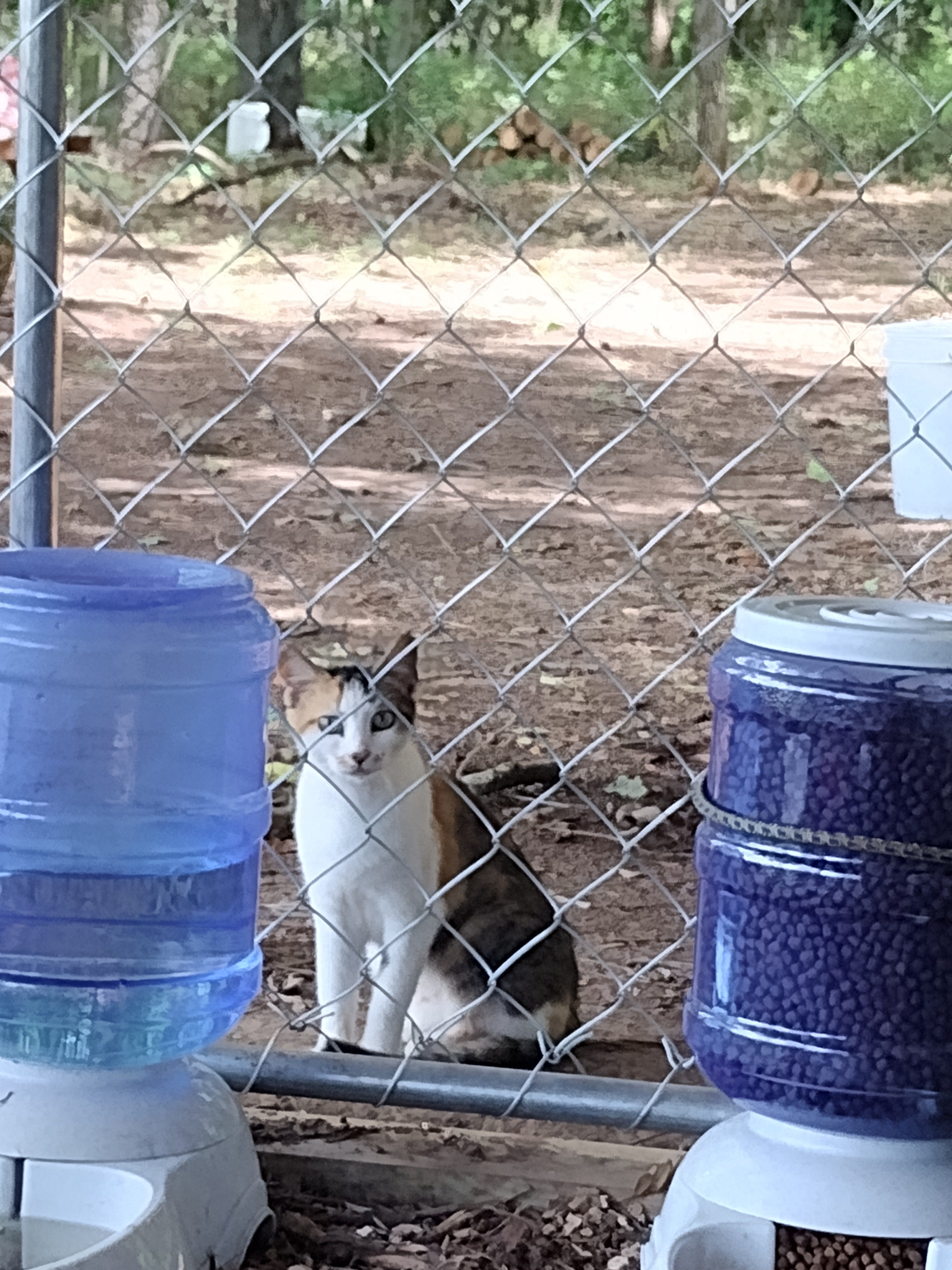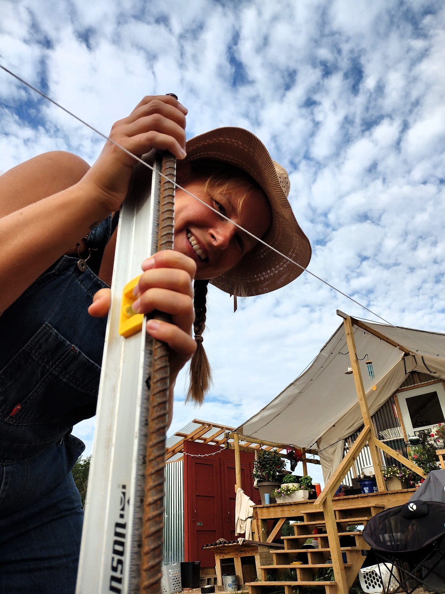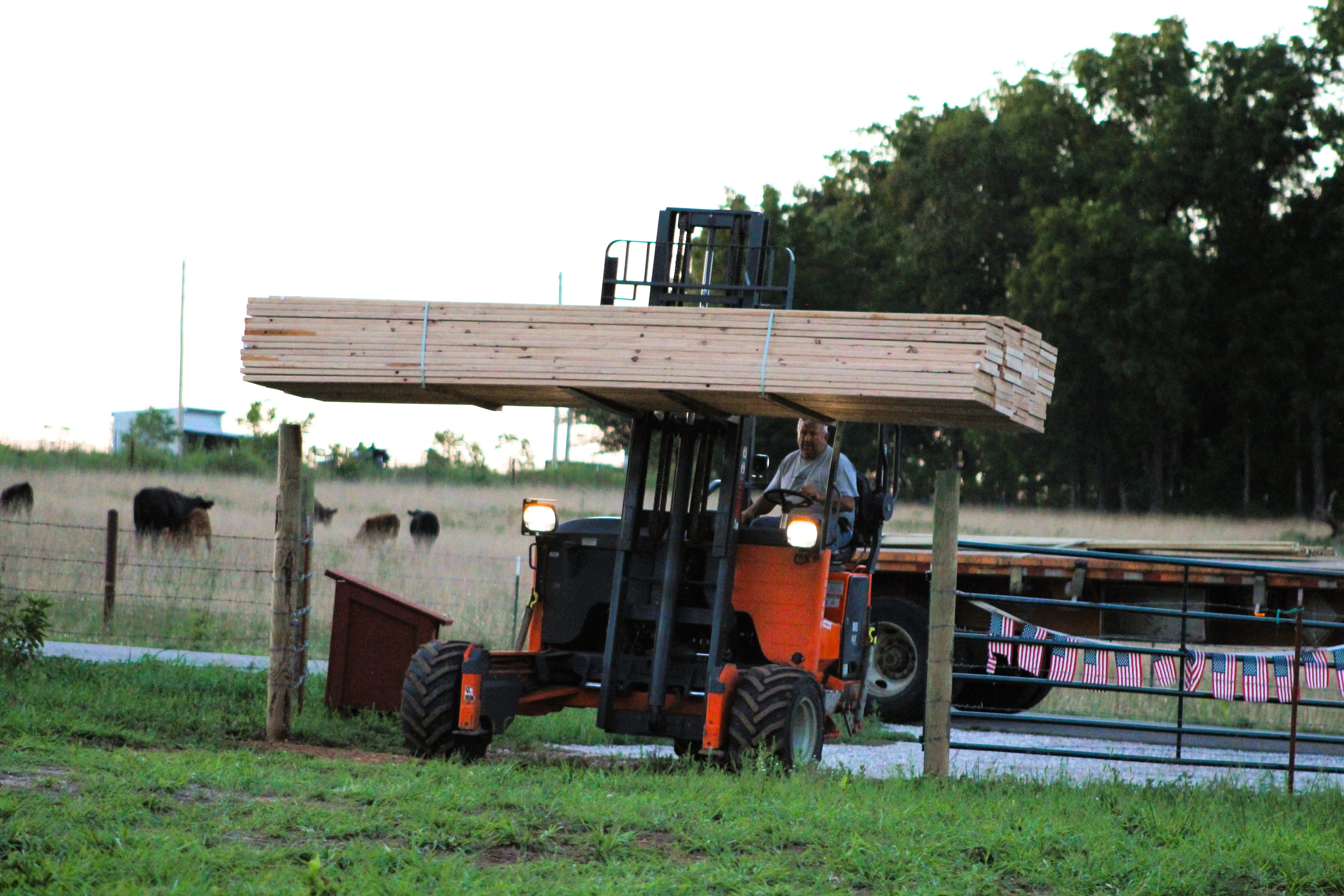 The week started with a stormy Saturday morning. We went to Bolivar to pick up groceries, and then we did a little cleaning and organizing of the tent for the rest of the day. The sun did come out eventually, but the build site was too muddy to do much of anything. Between the rainy Saturday and a restful Sunday, it was good to get a little break from the bunkhouse project. We all helped Bonnie-Jean watch over Tilde, who was recovering from her surgery. While taking a turn with her in the kennel, Grace caught a picture of the kitty who has been hanging around our place. We don't know if it is a stray or belongs to a neighbor.