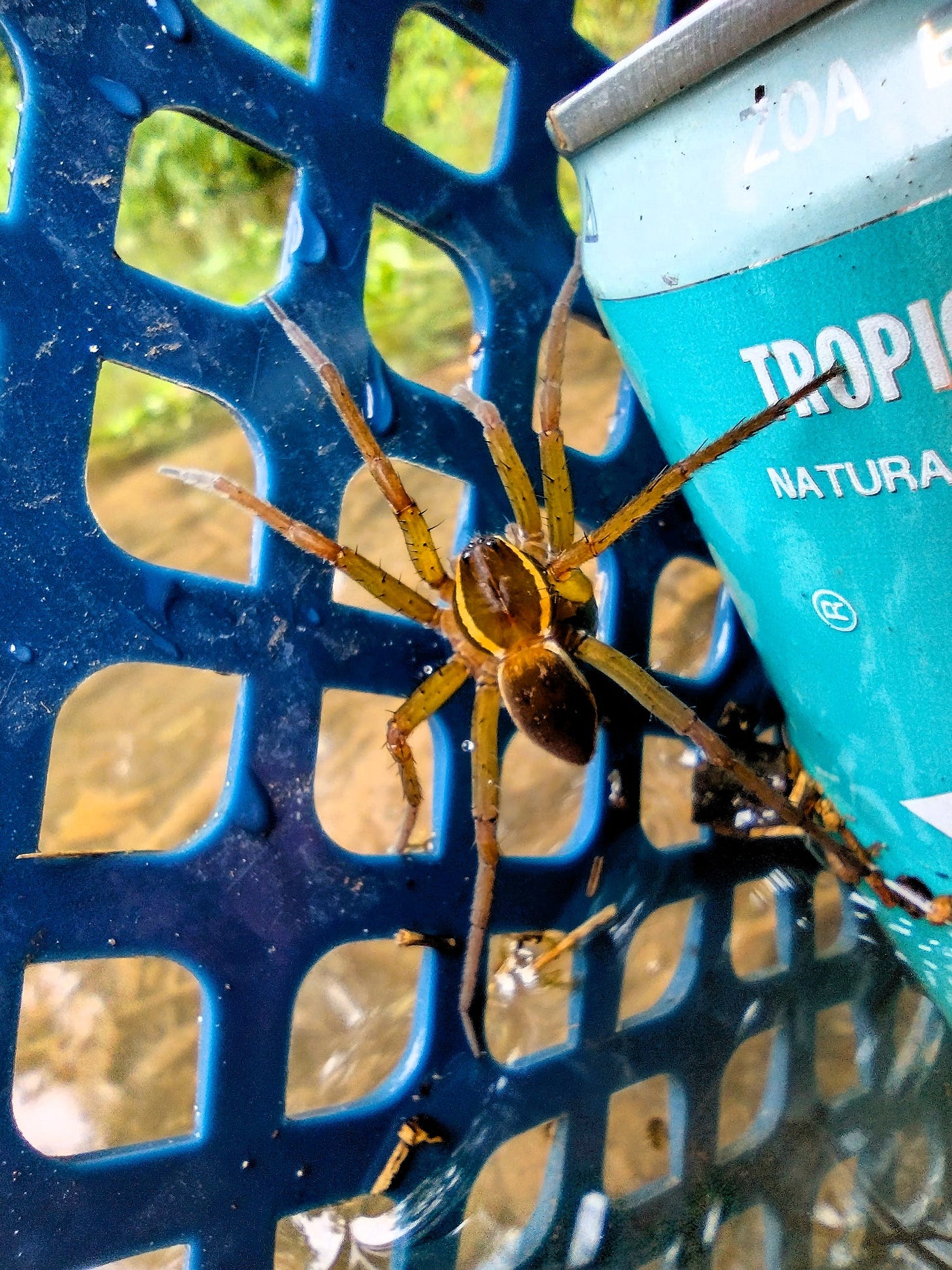 When it was all over, Jeremiah walked down to see what was left of the sodas we had chilling in the spring water. The sodas in the crates were still there, but everything outside was scattered along the banks. Several of us went down to collect the flavored seltzers, diet colas, and packages of the kids' CapriSun caught in the bramble. We found a spotted fishing spider in one of the soda crates, apparently hanging on for dear life.