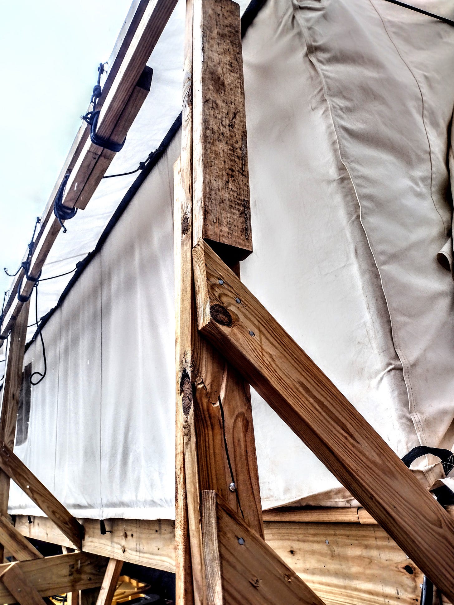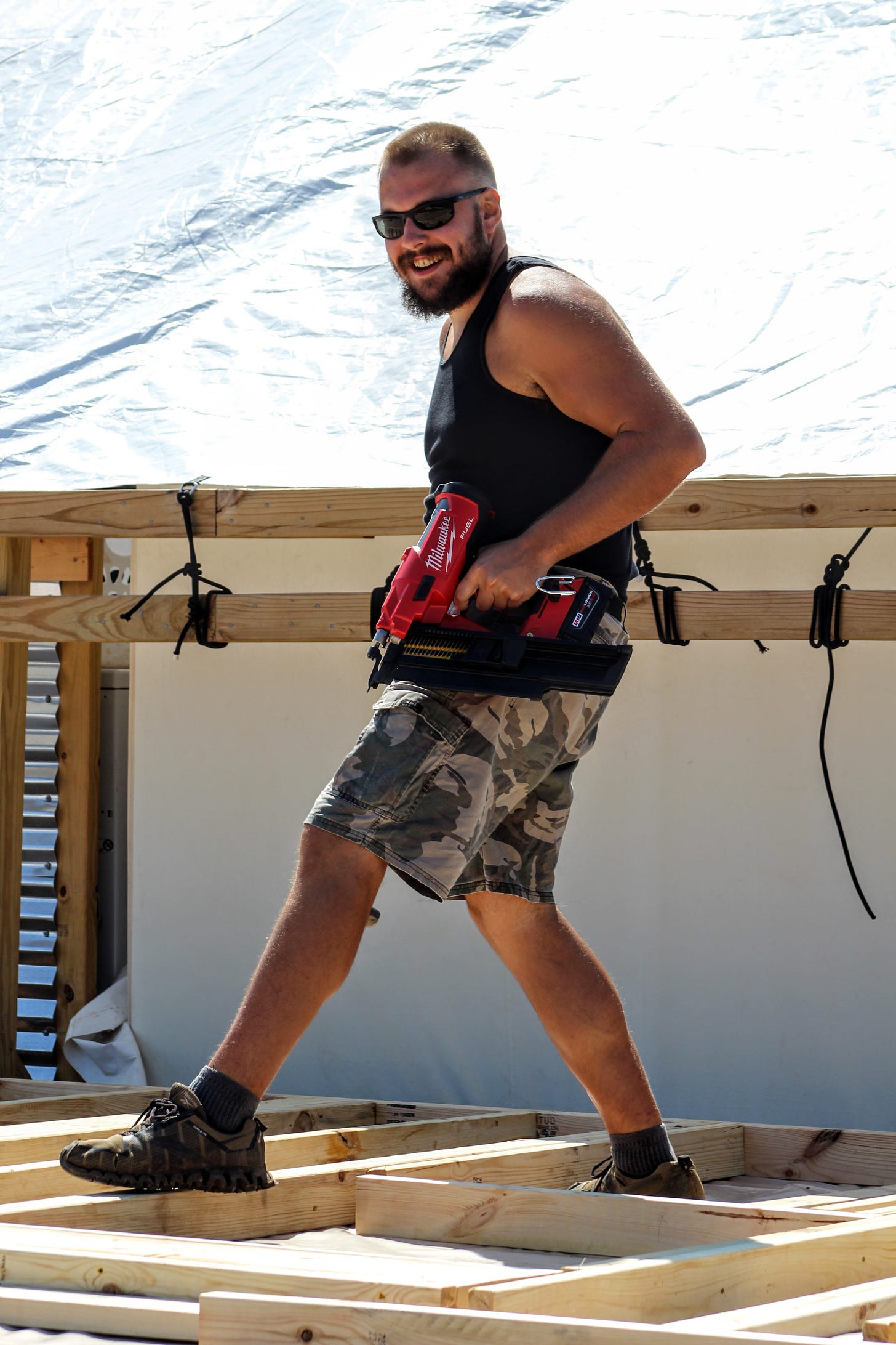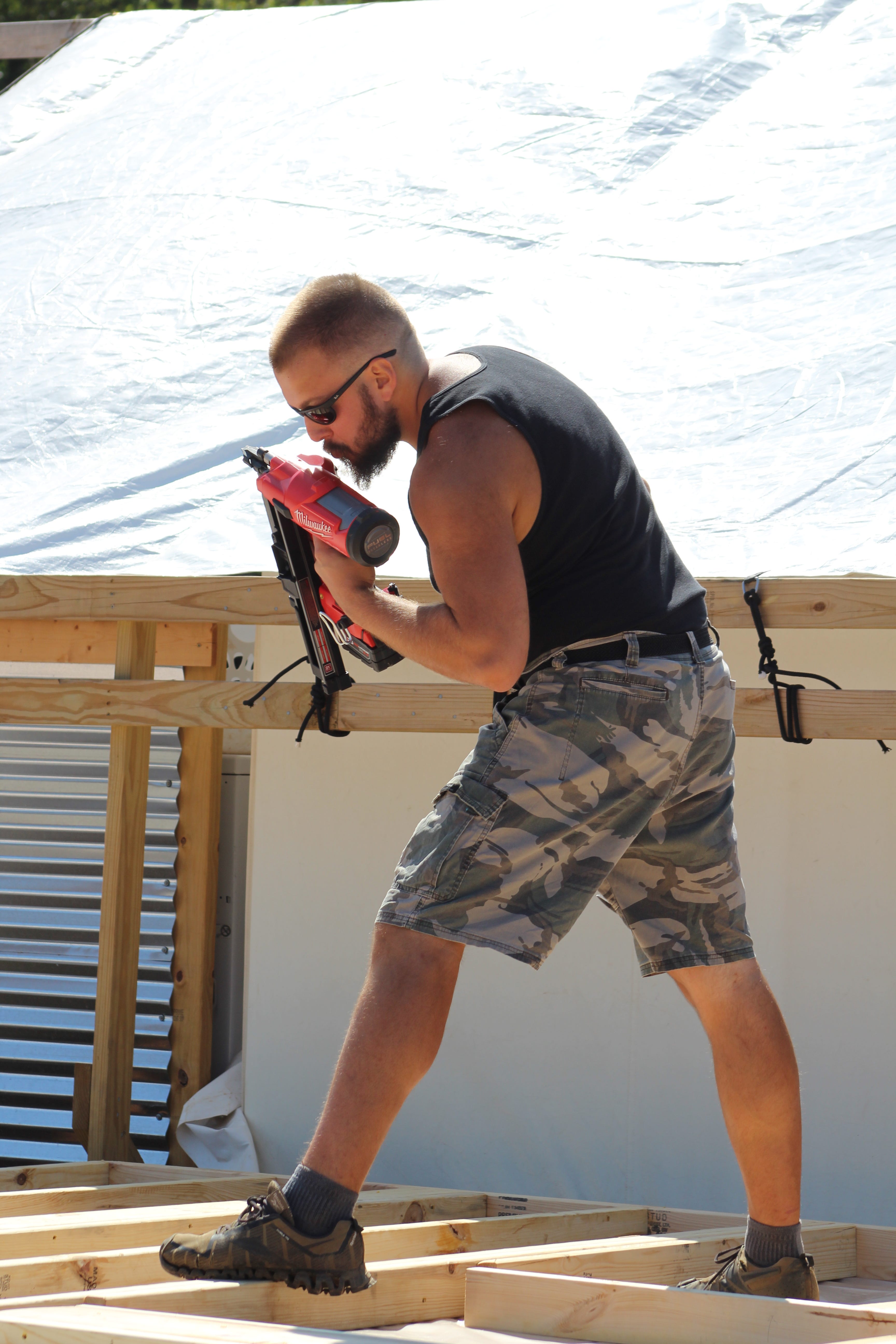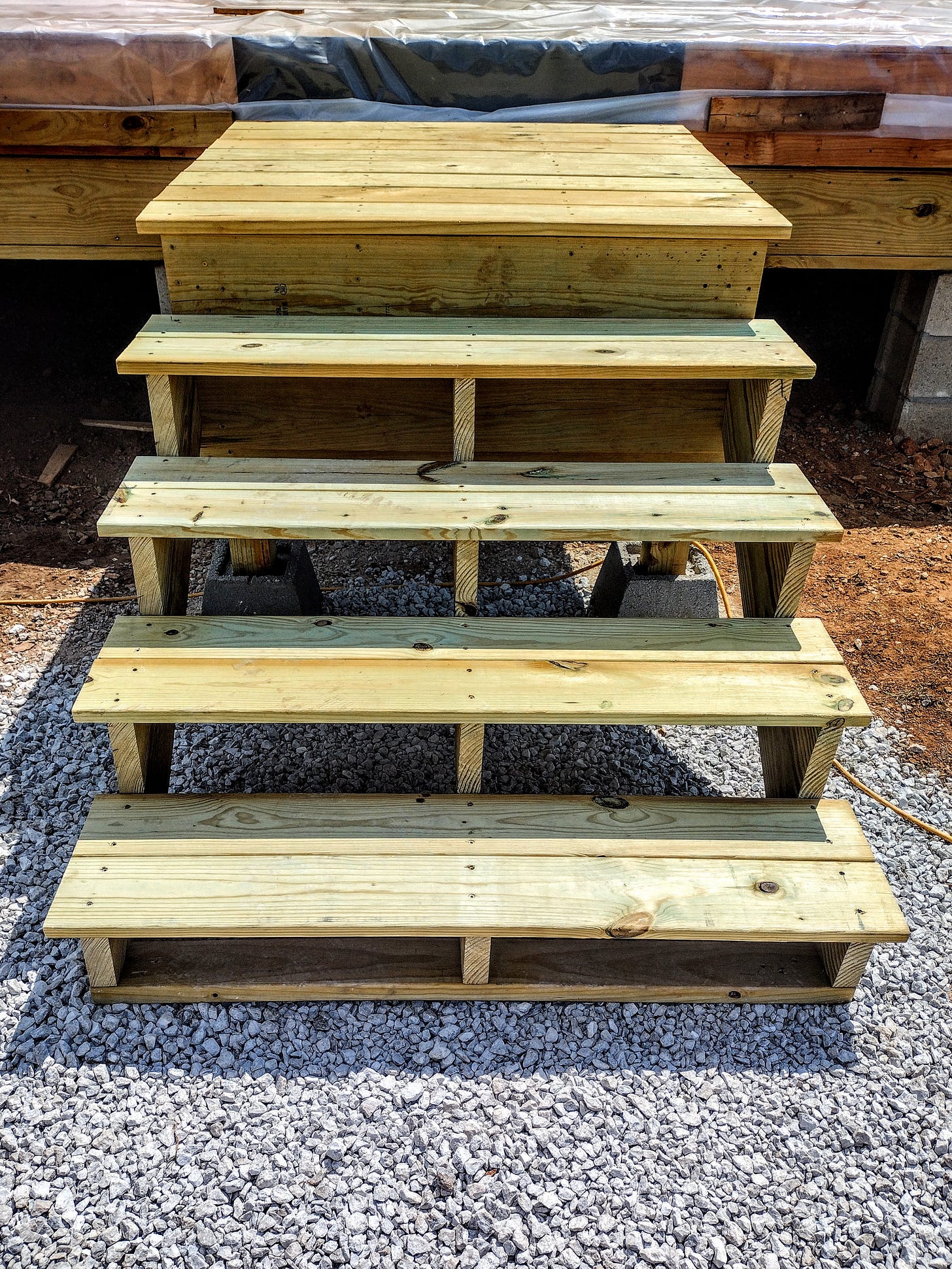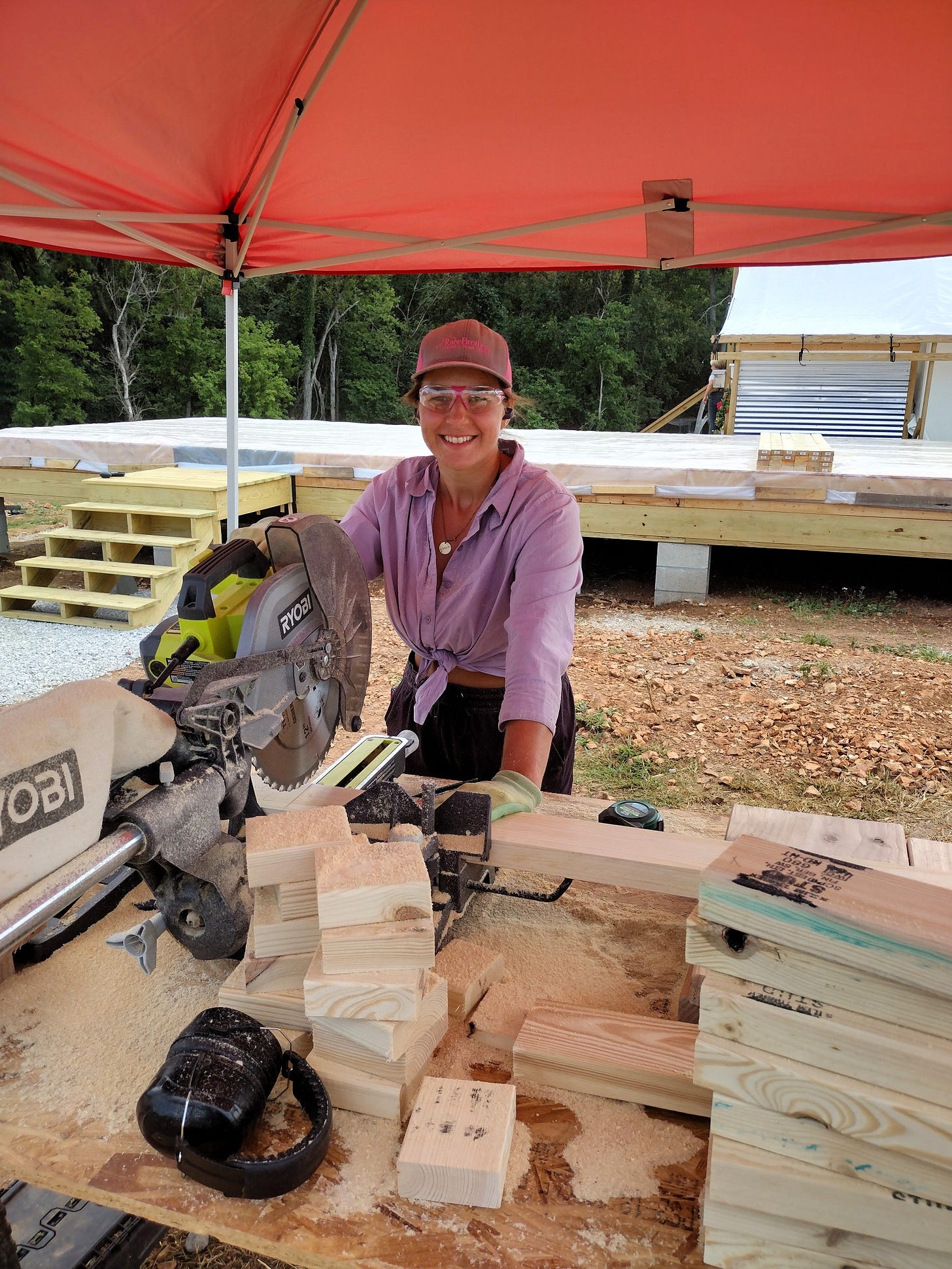 The week started out with a bit of a bang on Monday. The day started off sunny, so we finished our little porch project by building some stairs. Grace helped all the guys finish it up, and it turned out great. Having stairs makes accessing our build much simpler.