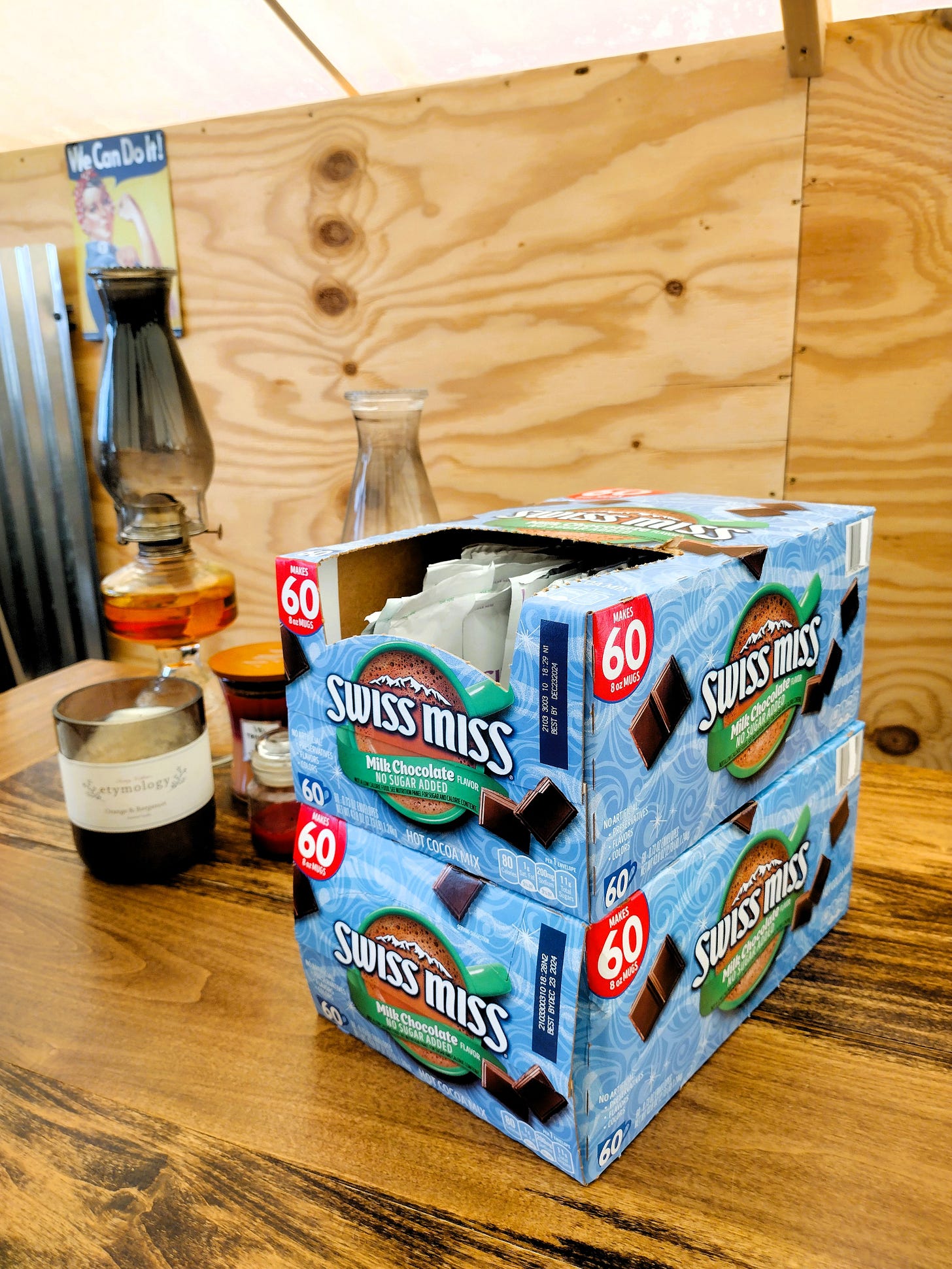 This week, tent evenings remind me of when we first moved out here -- the air conditioner off and the windows open to let in the cool breeze. With the cicadas quieting down, the softer songs of the crickets lull us again. We even have been hearing our owl, both in the evenings and in the early mornings. Suddenly, tea and hot chocolate sound good again, and we find ourselves ending our days with a steaming cup. We even had to stock up on some instant sugar-free instant hot cocoa mix.