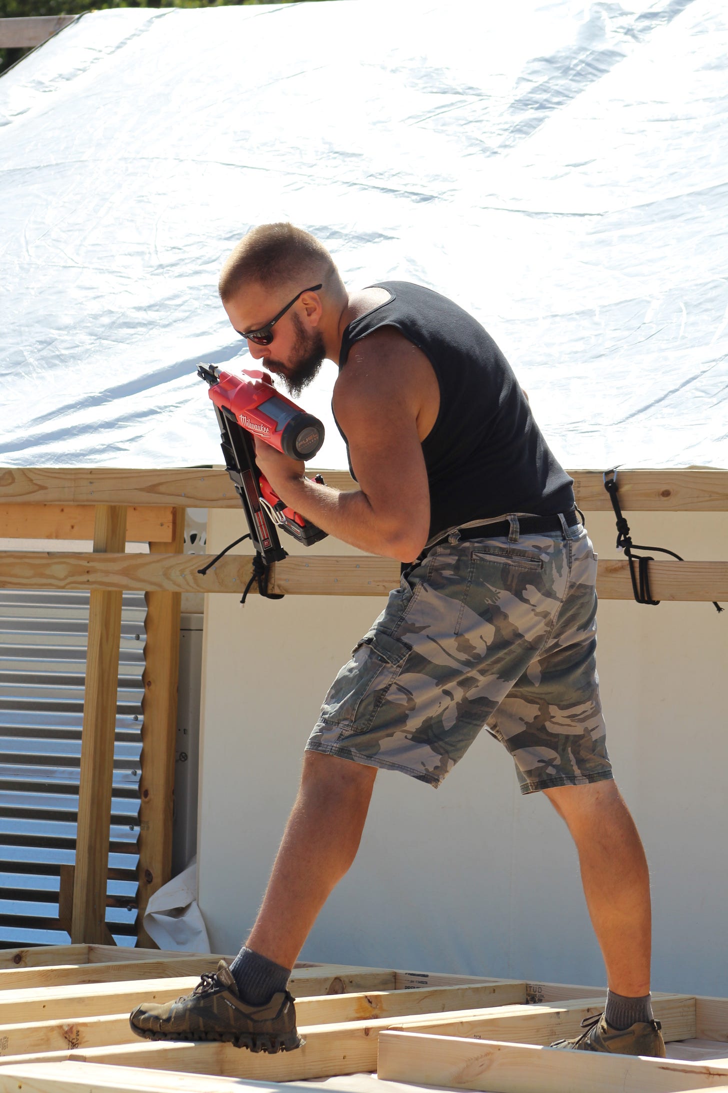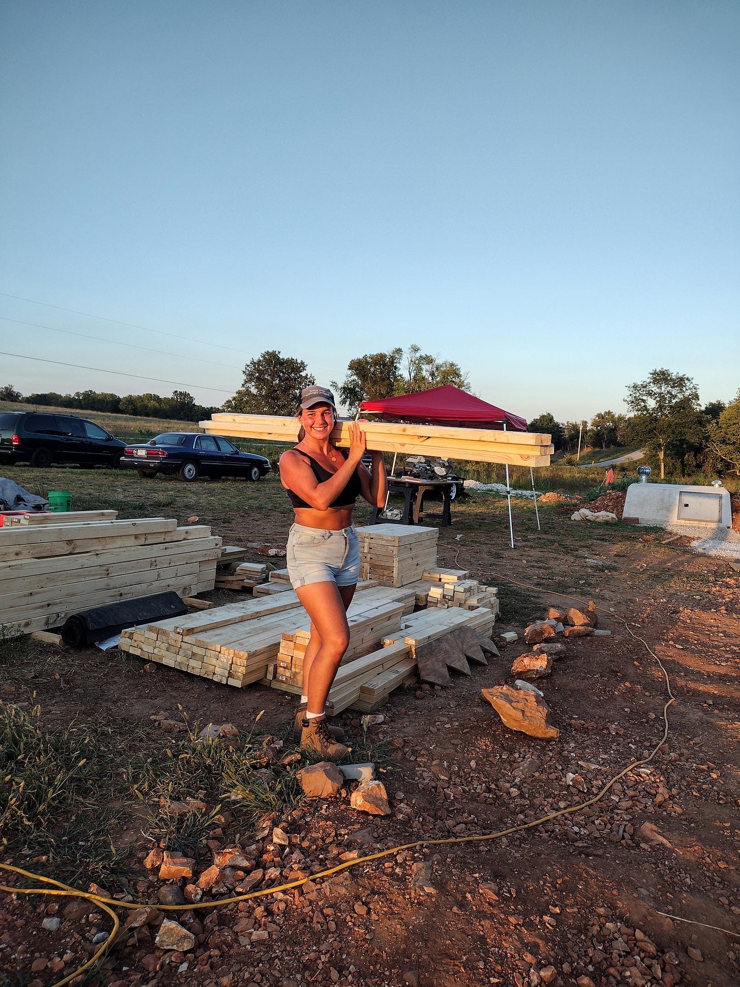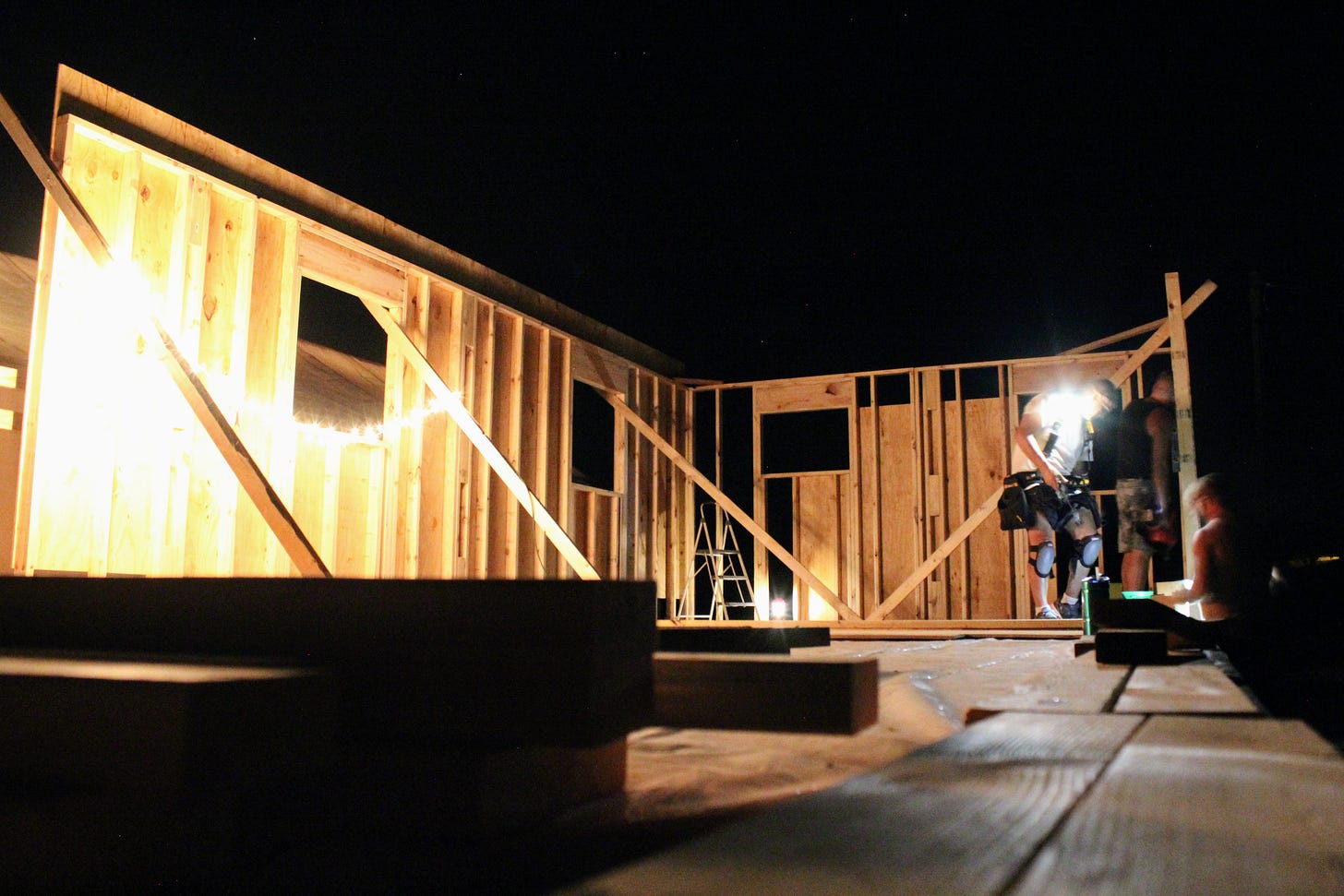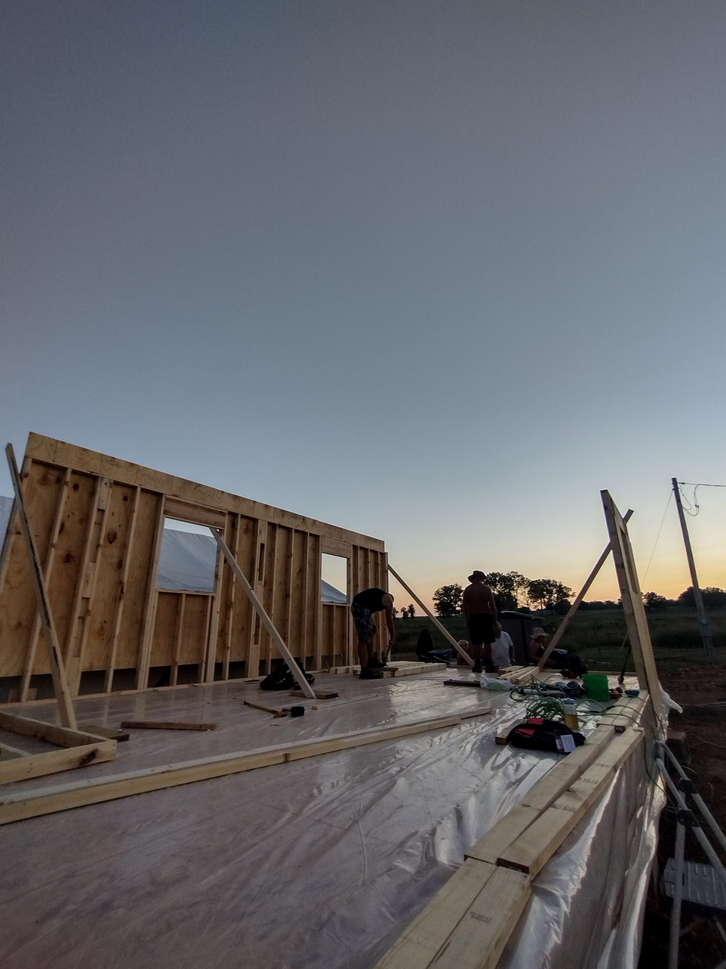 On Saturday, we had to pick up groceries early, but we spent the rest of the day actually assembling walls. I don't know what it is about the walls that feel so much more real than everything so far, but it feels like we are actually building a bunkhouse. We were thankful to have both our brothers, Levi and Jeremiah, home to help with the heavy lifting. We tried to get three-sides up on one end of the house. It took us a long time with our first section, though, as there was a small learning curve figuring out how we wanted to do it. After that, we went more quickly on the next two sections. We worked until after dark, but the atmosphere was festive, as we had desperately hung a box of twinkle lights up in order to see. Bonnie-Jean made everyone sandwiches, and she even fixed us hot chocolate while we cleaned up. Even though we were exhausted, I have to say finishing beneath a blanket of stars was a rather lovely experience.