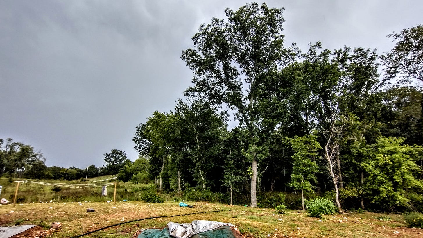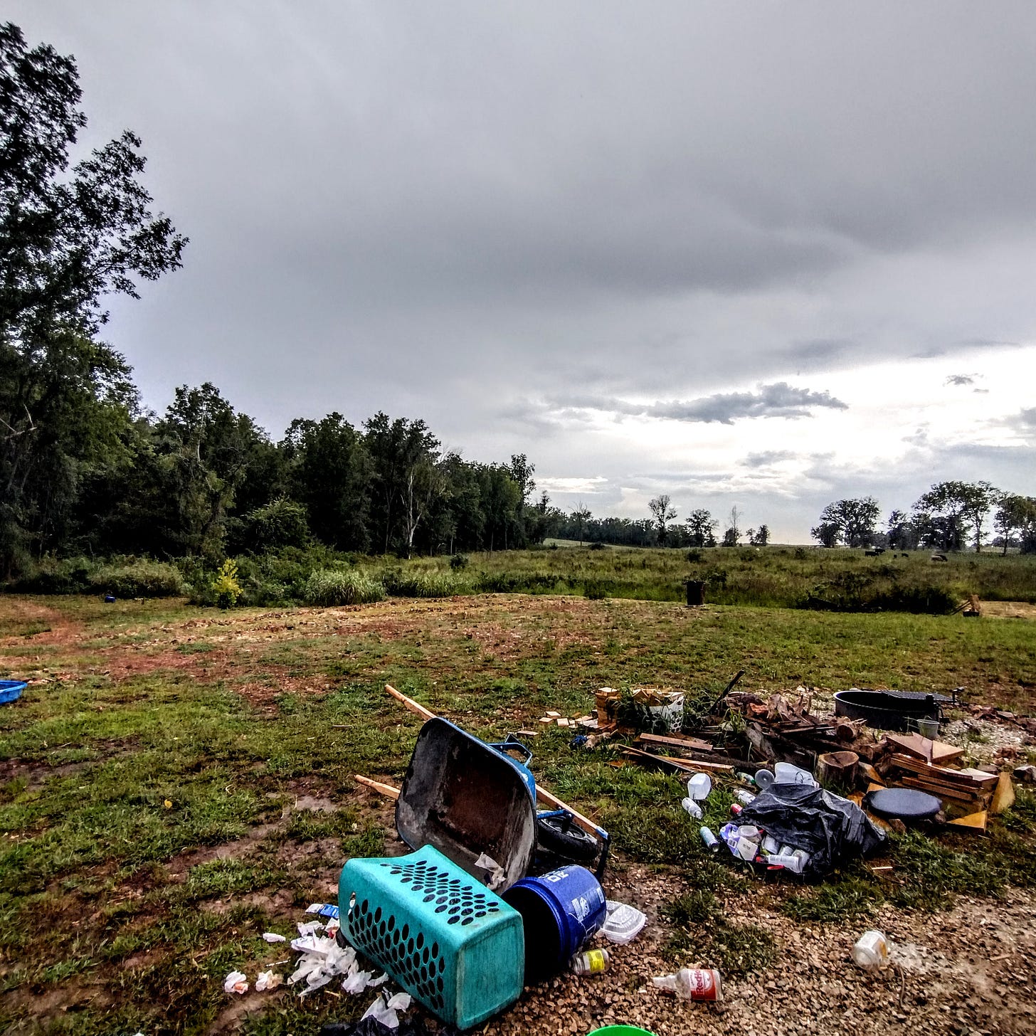 During the afternoon, we were surprised to see the sky cloud up suddenly. We hadn't heard anything about rain or bad weather. Minutes later, we got hit with some dust-filled high winds that cracked several pieces of our tent frame and twisted two canopies beyond recognition. It happened so fast -- we had no time to prepare. Thankfully, all the guys were home and made quick repairs to the tent frame while we tried to take down our last canopy before it was destroyed as well. It was a process to get everyone down to the shelter, but we finally settled in down there for a little while -- but at that point the worst seemed to be over. When we came up, we had a terrible mess. All of our trash and recycling buckets had blown over and debris was everywhere. Pool floaties had blown all over our field and one even went across the road. The lid from our well house had been ripped off and bent on one side, breaking the lock holding it in place. Bonnie-Jean had been cooking, and some of the food had literally blown away. We spent about an hour cleaning up, collecting trash and ruined food to compost. We were thankful, though, that everyone had been home and that the guys had thought to act quickly to save our tent. If it had just been us ladies, I think we would have just ran for cover without thinking about anything else. Who knows what damage the wind would have continued to do if left unchecked.
