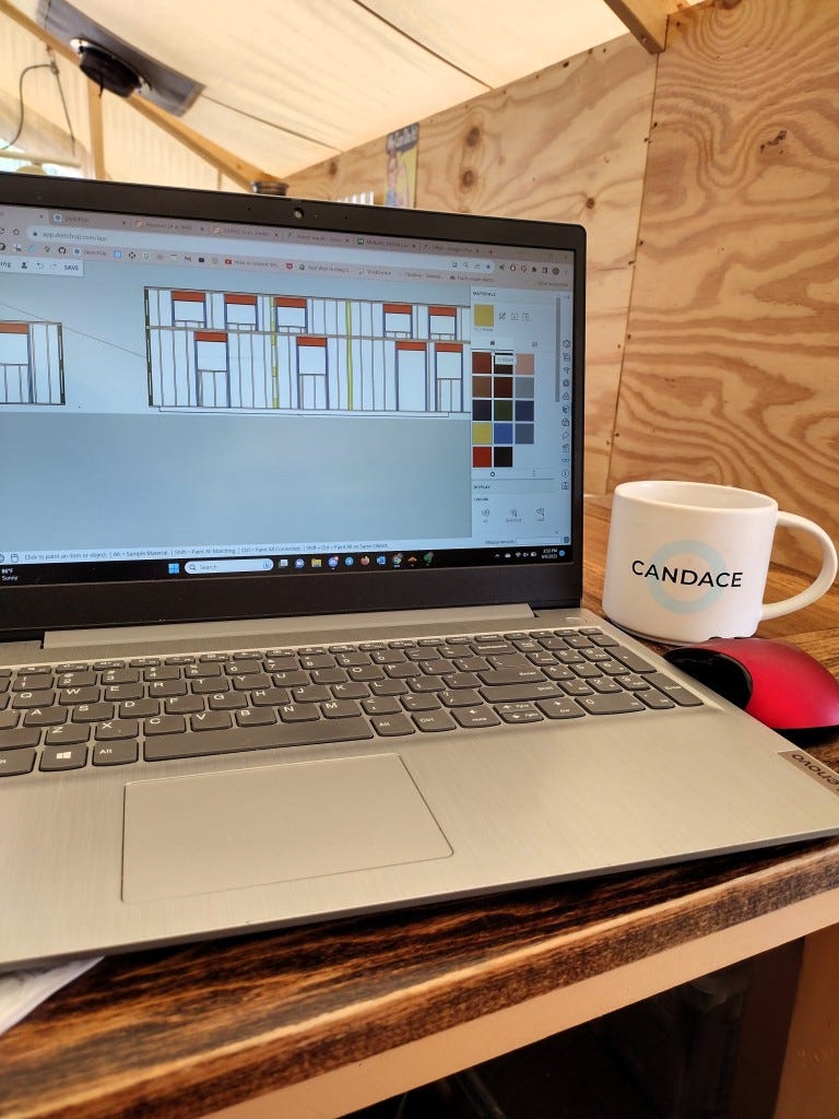 The storm ushered in cooler weather, which is always a blessing. I spent the first part of the week working on the plans for our walls, checking and double checking window and door placements, making sure the math all added up. I had a set back when I realized that, in construction, an "eight-foot wall" is not actually eight feet tall. Rather, using standard 92-5/8-inch studs, the wall comes to 8 feet 1 1/8 inches. The extra space gives you wiggle room when finishing the interior of the building.