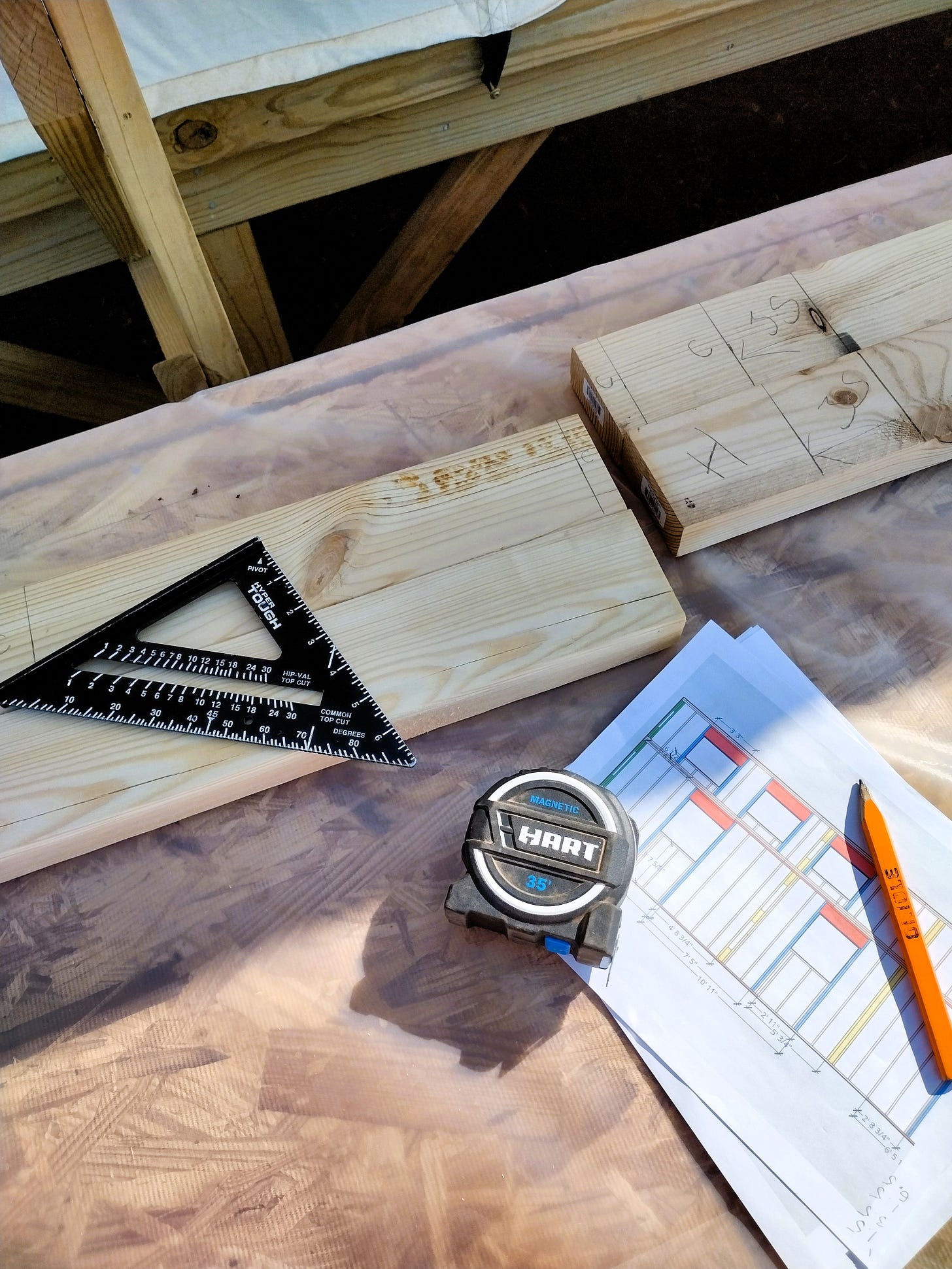 When we had finished cutting almost all the lumber for our walls, I started working on layout. It took me a couple hours to get all the plans copied onto our bottom and top plates, and when I was done I felt rather victorious. (I may or may not have danced the Electric Slide to some Alan Jackson in our will-be living room.)