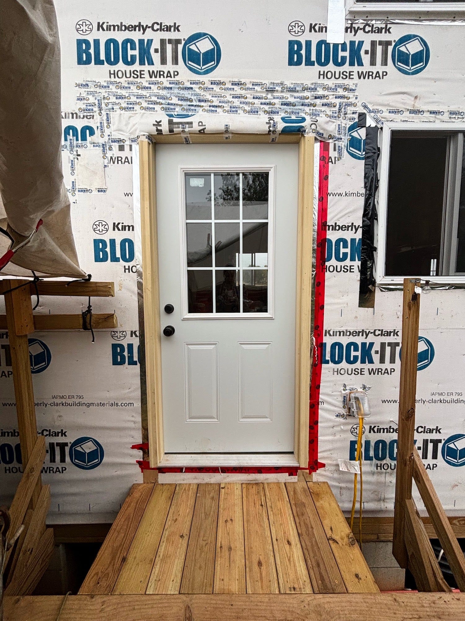 With our Dad's help, we installed one of our living room windows. Our dad also worked on getting our bunkhouse entrance accessible from the tent deck. He rolled back our tent fly, modifying our frame so that we can get to the front door. He built a walkway between the deck and the door. Finally, he installed a doorknob. Now, we can walk quickly between the tent and the bunkhouse -- another luxury we can't get over. It's already saved us so much time.