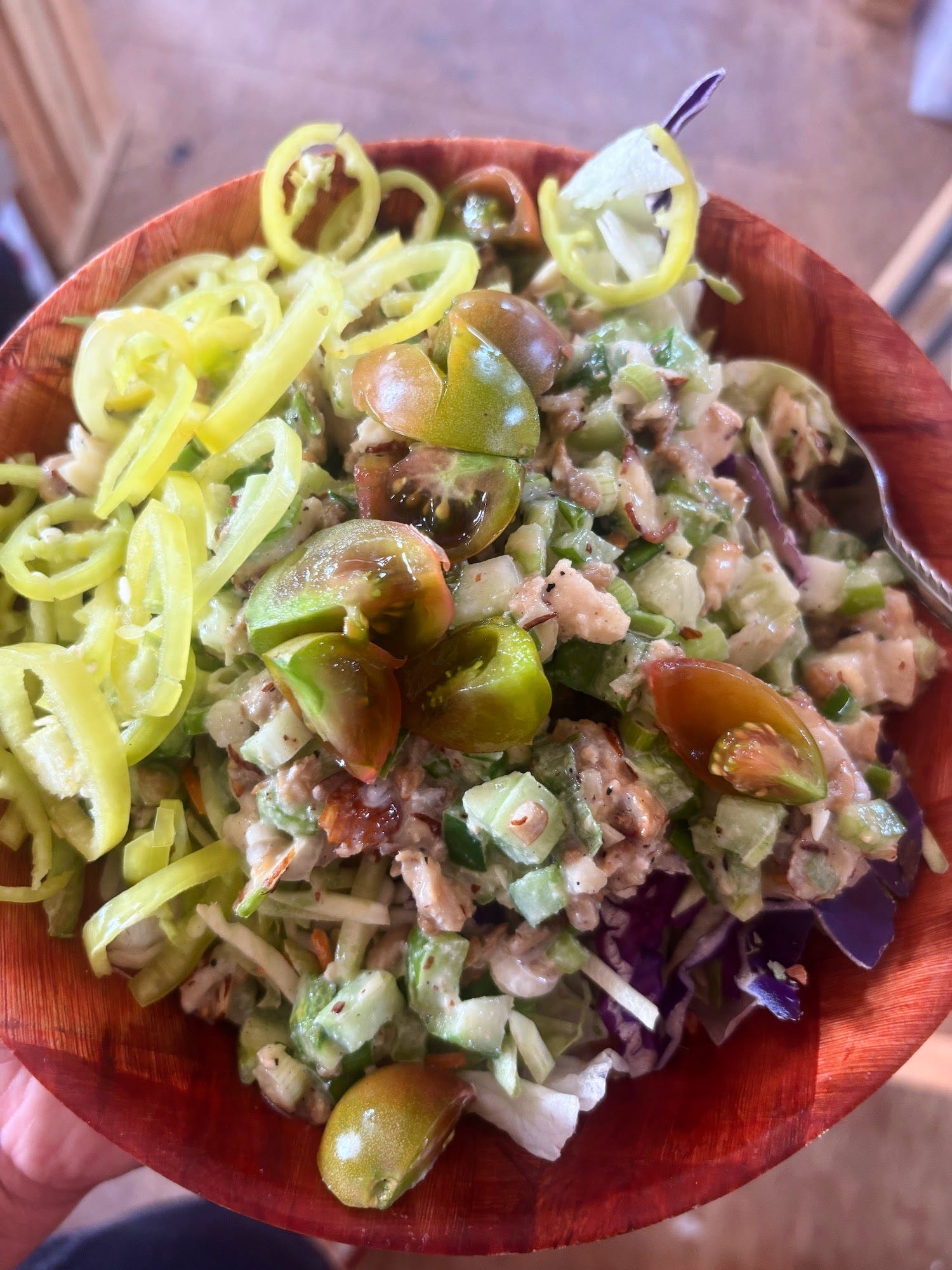 While we were busy running in so many different directions, we felt like we were dining like queens. I've mentioned before that we make a real effort to eat healthy due to several health concerns. After some research, the ladies in the family decided to give a more Paleo-type diet a try. Since it's more fresh food than we are used to, we spent one morning this week doing our food prep -- marinating chicken for our dinners, grilling chicken to keep cold for lunches, chopping veggies to snack on and making a big salad for our lunches. On weekdays, Bonnie-Jean assembles our breakfast and lunch to free the rest of us up to work on the bunkhouse project. This way of eating is not that different for us, as we usually eat low carb and fairly natural. The big change is cutting out grains and dairy entirely. I have missed cream in my morning coffee, but that's really the only thing. Enjoying all the fruits and veggies we want has felt almost decadent, as we are used to chugging protein shakes half the time. We still make brown rice, baked oats, and sourdough bread for the men and kids. I'm looking forward to seeing how going without grains and dairy impacts our health.