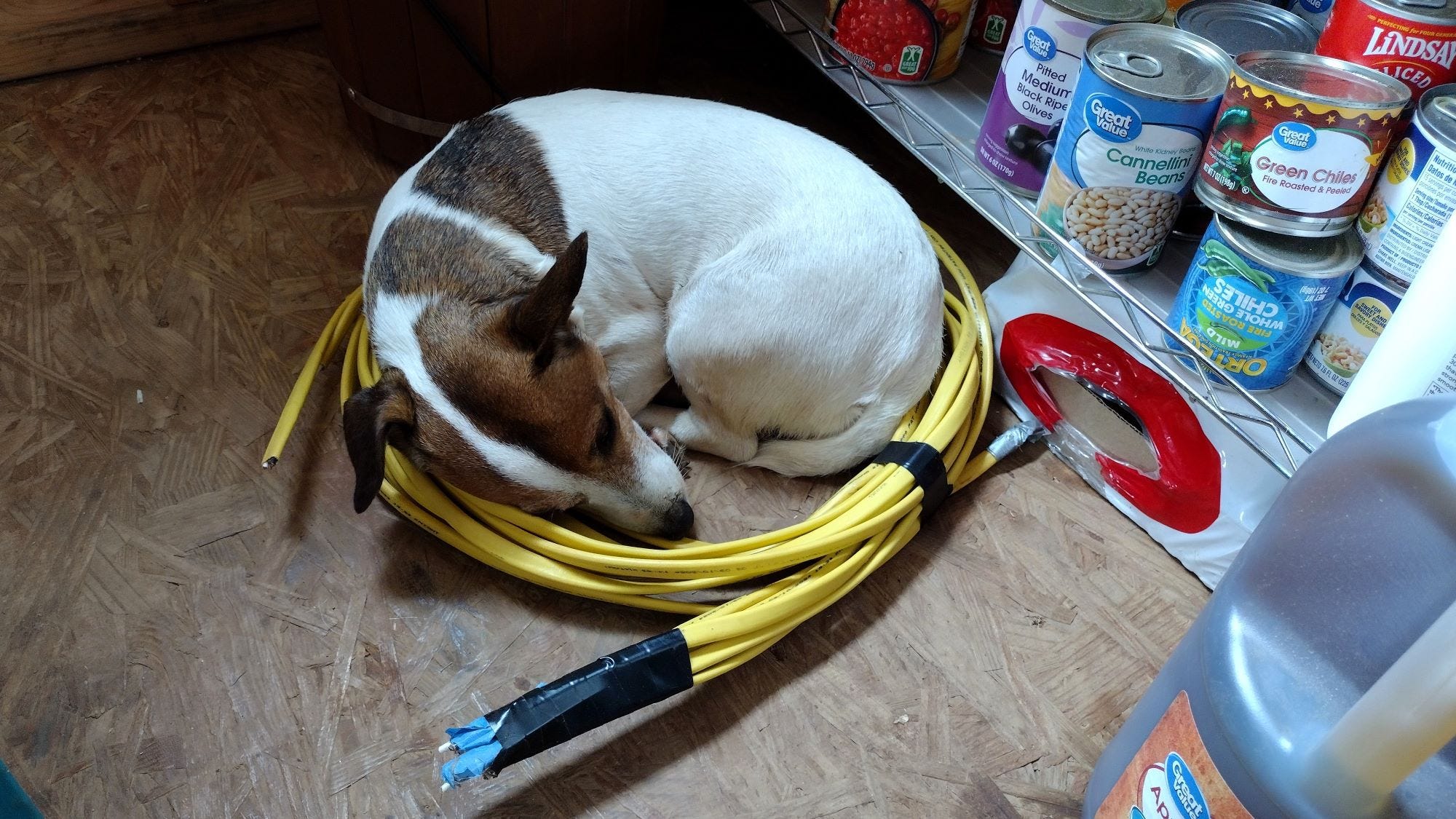 Once the electric was on, we went right to work moving extension cords. For more than a year, we have been running everything off of two duplex outlets on the side of our office. We had several hundred foot extension chords running here and there, all laid out so we could easily switch between powering parts of the bunkhouse, the tent, and the outdoors. Now, we can run anything we want. When I want to plug in a slow cooker, or run a saw, or make a cup of tea, I don't need to figure out what I can unplug first. As I said above -- it is an absolute luxury.