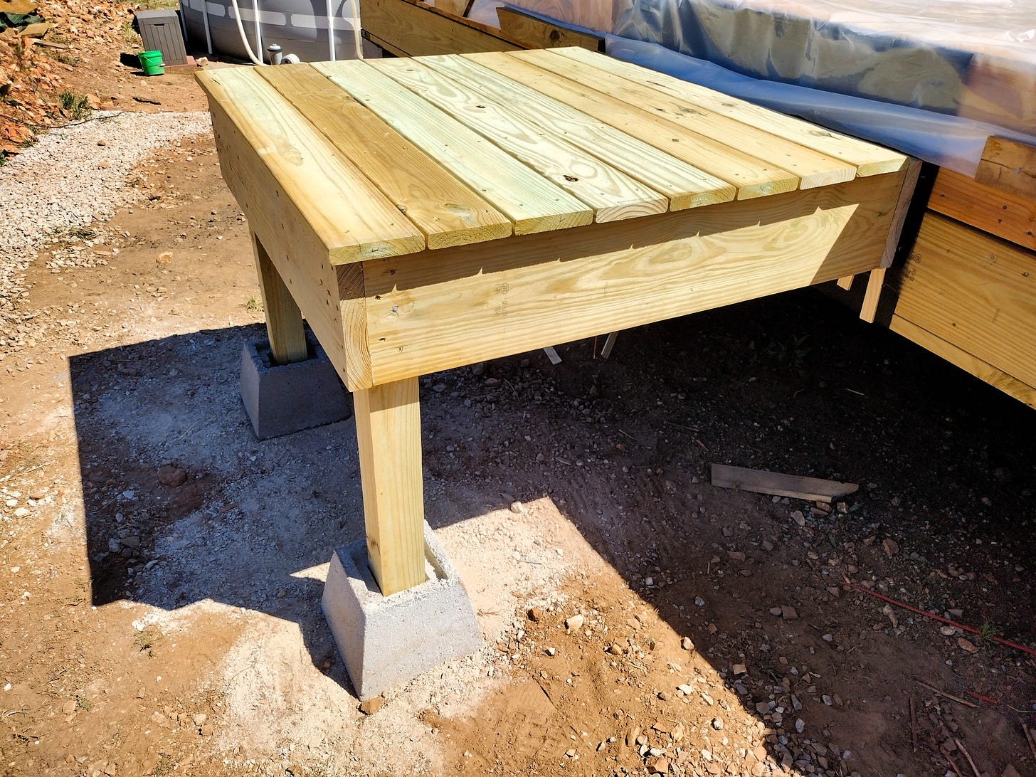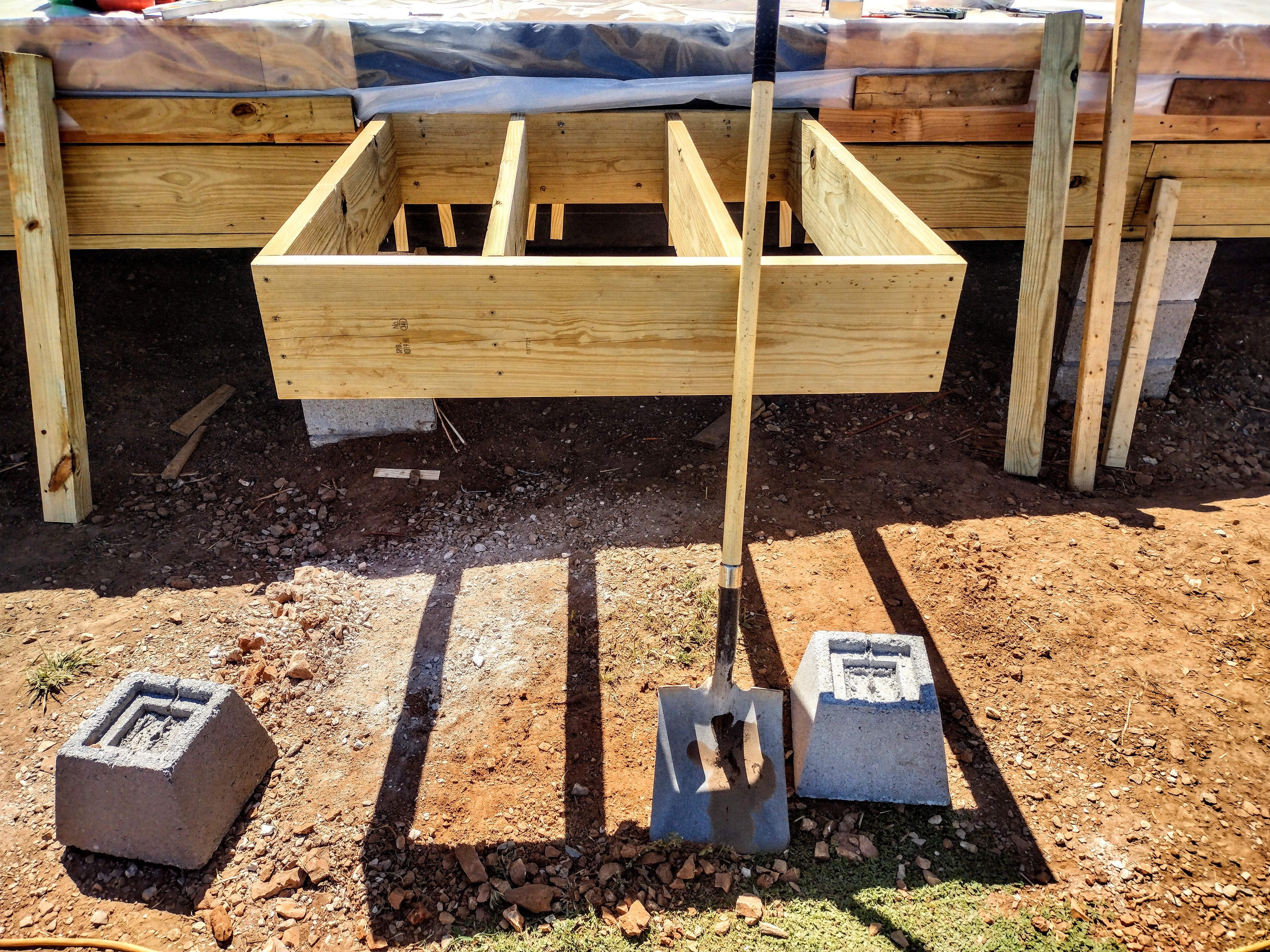 Once the floor was done, the whole project was too high off the ground to make access easy, so we decided to use some leftover lumber to build a small stairway and landing where our back door will be. We had almost everything -- we just needed a 4x4 and some decking from the local hardware store. We built the porch on Friday and plan to finish the stairs early next week.