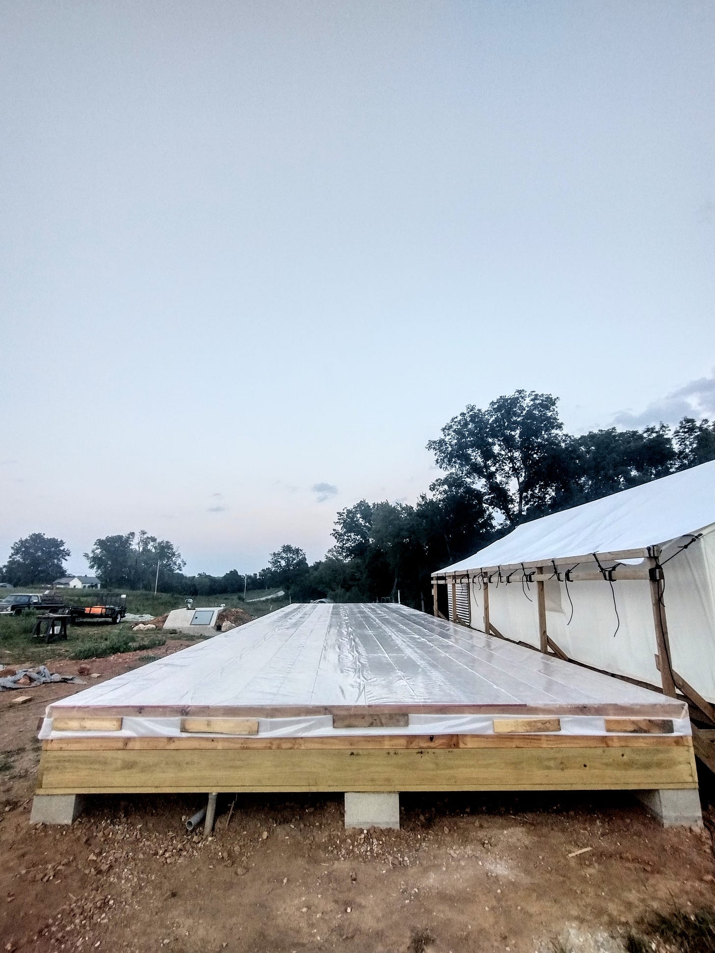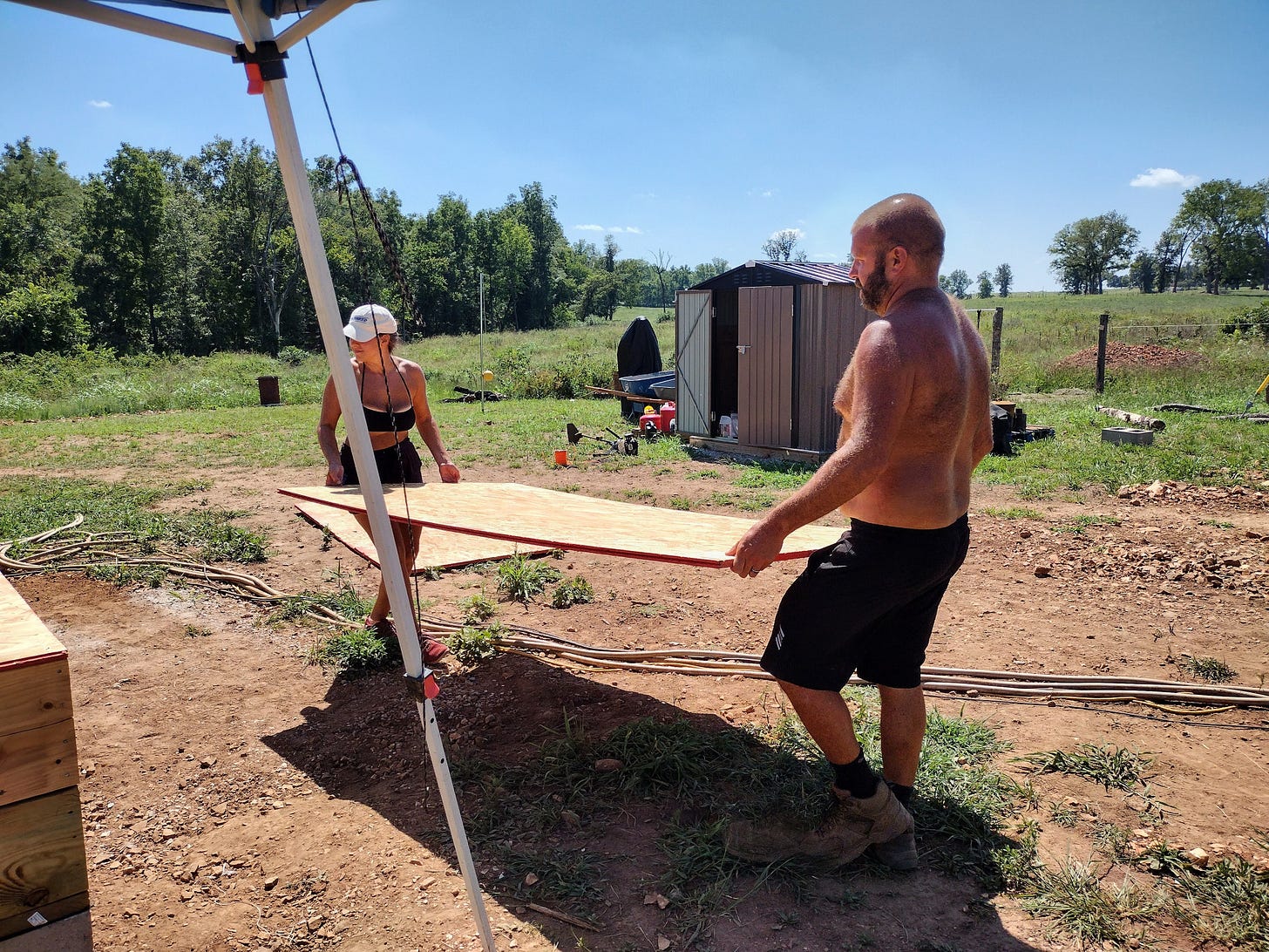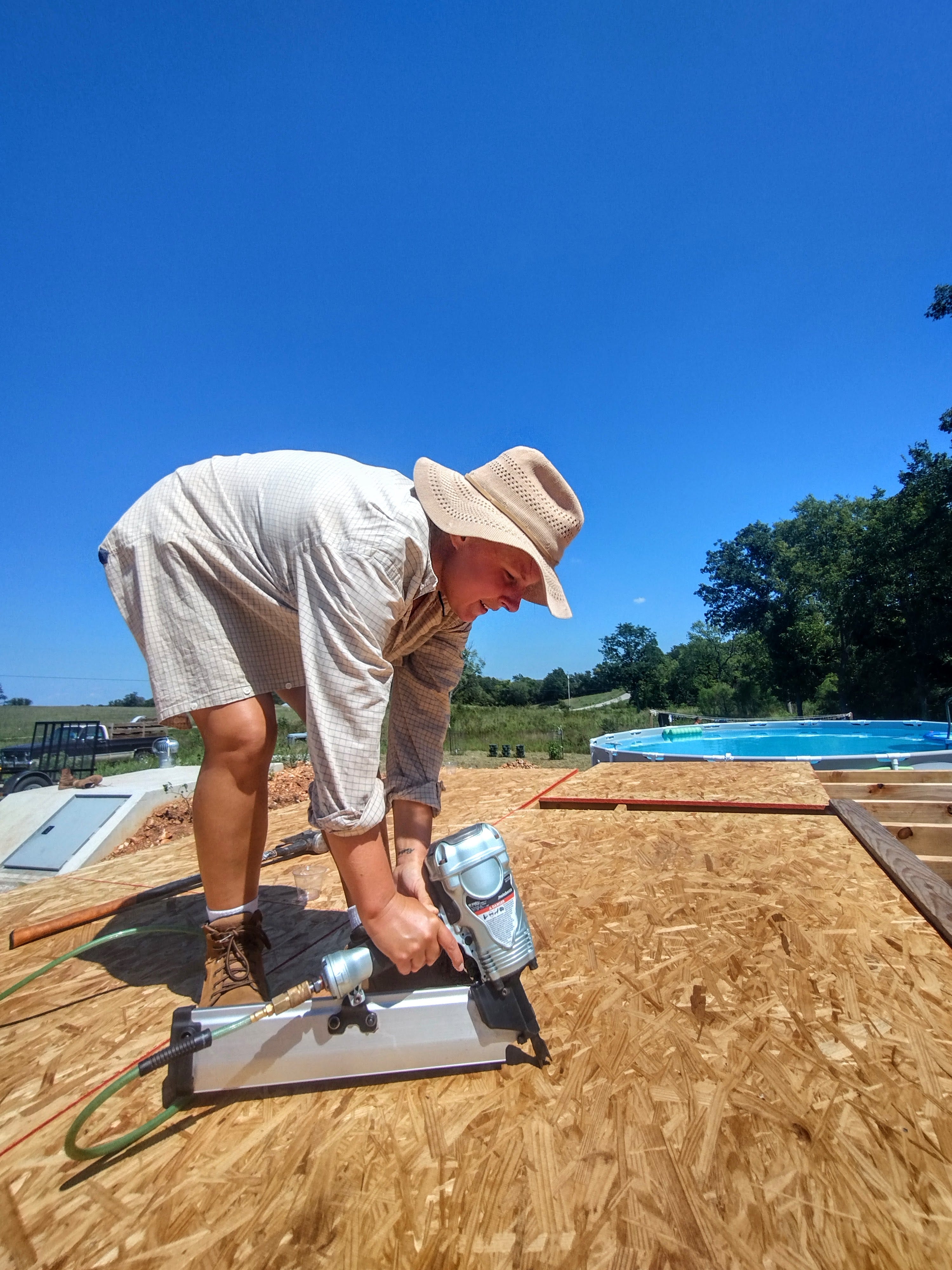 We finished sheathing our floor on Tuesday. It was a long day, and we realized we didn't take many photos. I got to use the nail gun for quite awhile, and after that experience, I am very much a fan of pneumatic nailers. I couldn't believe how fast I was able to work. When we were done with the sheathing, it felt amazing to actually walk around our bunk house. We covered the whole platform with plastic in case of rain. This tip was recommended by Deep South Homestead, and it seemed like a terrific idea. We celebrated with sandwiches with real bread for dinner. It might sound silly, but when most of the family doesn't eat bread very often, sandwiches are quite the treat.